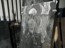 Предварительно станком делается портрет лица усопшего, остальная гравировка – ручная работа. В последнем кадре из подборки представлено ростовое изображение, плита расположена вертикально.