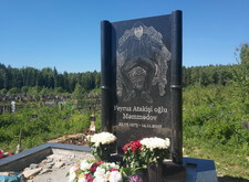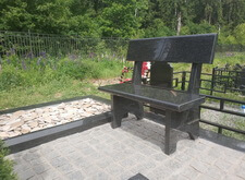 Собираем лавочку, устанавливаем её напротив надгробья. Цветник у подножья мемориальной стелы наполняем светлыми камнями. Под полукруглую арку памятника укрепляем вырезанную из гранита фигуру полумесяца.